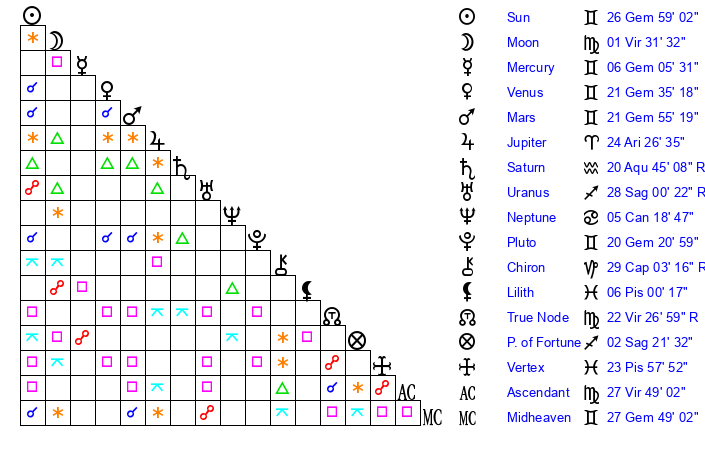 | Sun | 26 Gemini 59 | 27 Gemini 42 | 23 Libra 54 |