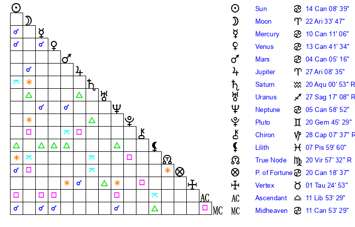 | Jupiter | 26 Aries 51 | 6 Cancer 7 | 22 Aries 35 |