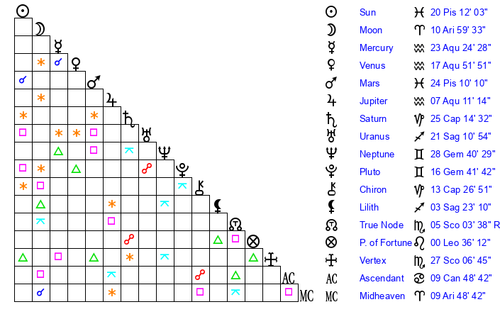 | Sun | 20 Pisces 12 | 21 Pisces 22 | 19 Cancer 22 |