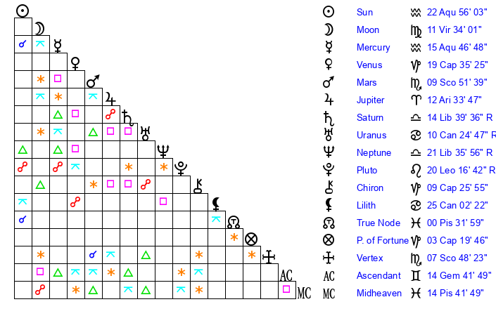 | Saturn | 15 Libra 12 | 18 Pisces 40 | 10 Libra 25 |