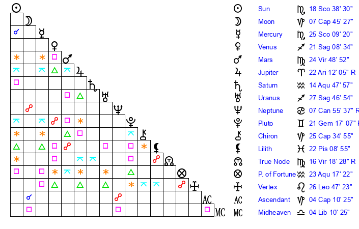 | Sun | 18 Scorpio 39 | 19 Scorpio 18 | 21 Pisces 13 |