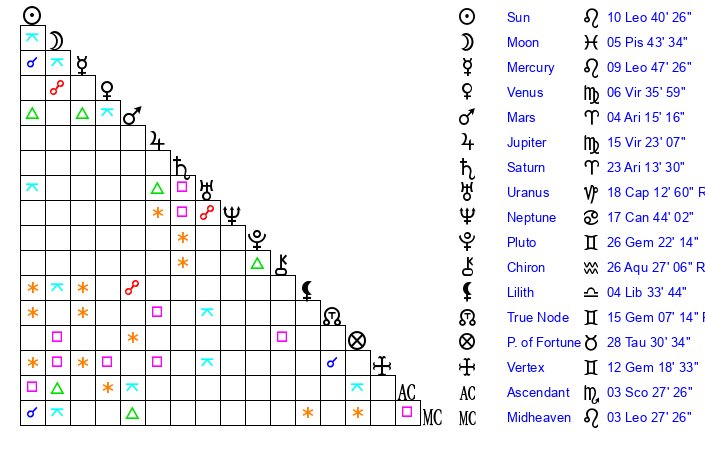 | Sun | 10 Leo 41 | 11 Leo 36 | 4 Sagittarius 50 |