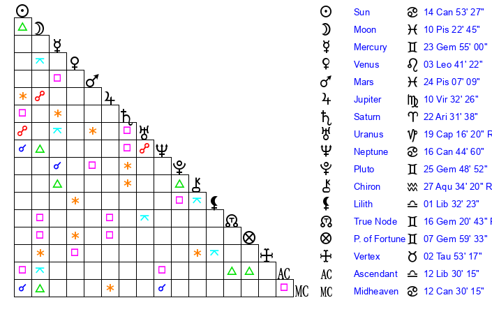 | Sun | 14 Cancer 54 | 15 Cancer 50 | 7 Scorpio 38 |