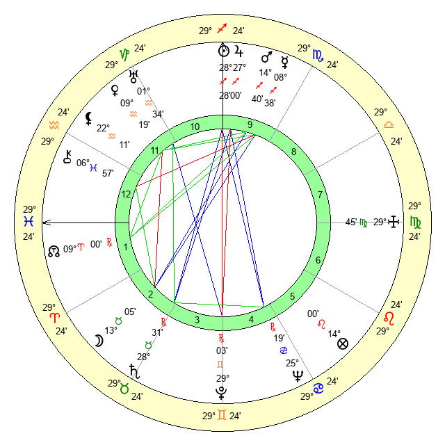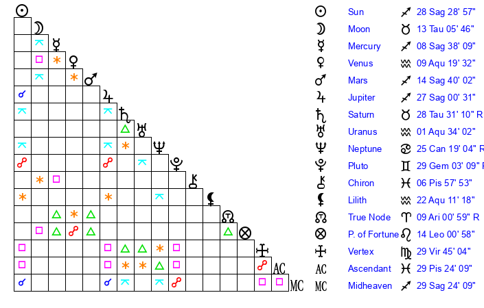 | Saturn | 29 Taurus 14 | 25 Pisces 31 | 2 Gemini 22 |