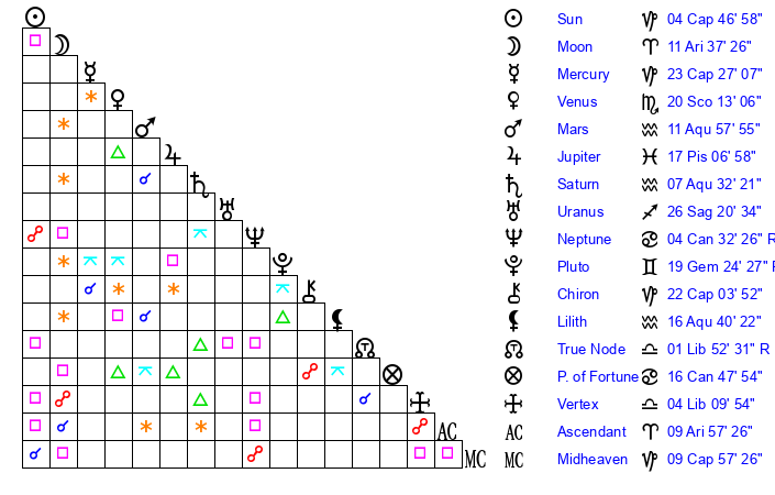| Moon | 11 Aries 37 | 5 Aries 7 | 7 Libra 18 |