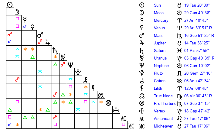 | Sun | 19 Taurus 21 | 20 Taurus 17 | 14 Virgo 23 |