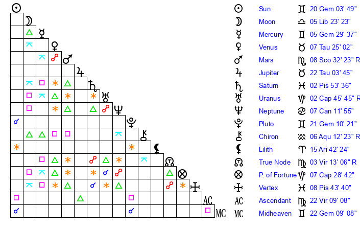 | Pluto | 21 Gemini 11 | 3 Aquarius 29 | 22 Gemini 42 |