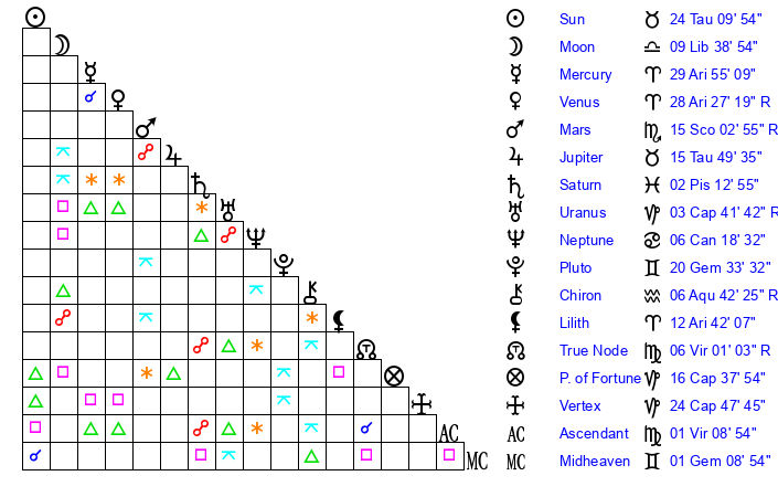 | Sun | 24 Taurus 10 | 25 Taurus 7 | 19 Virgo 14 |