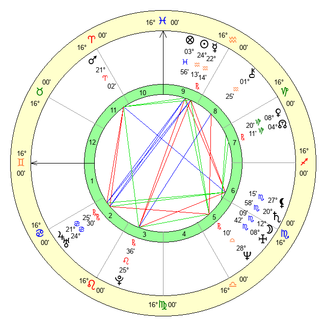 | Saturn | 21 Scorpio 27 | 18 Pisces 47 | 19 Scorpio 29 |