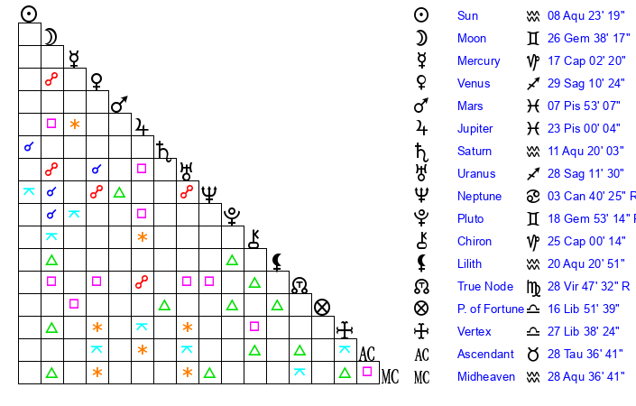 | Moon | 26 Gemini 44 | 12 Aquarius 20 | 11 Sagittarius 58 |