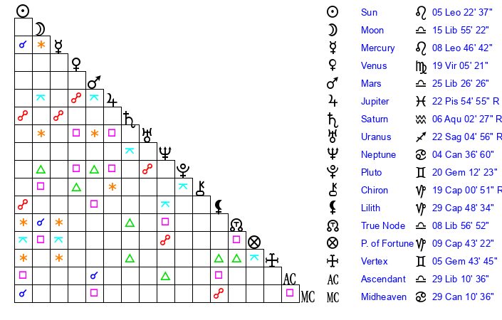 | Moon | 16 Libra 1 | 5 Libra 49 | 21 Pisces 31 |