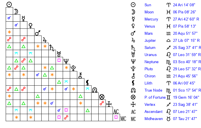 | Sun | 24 Aries 14 | 25 Aries 0 | 28 Gemini 50 |