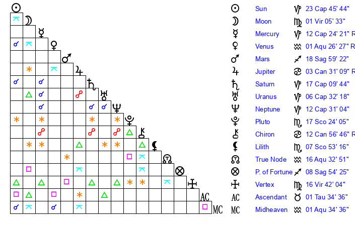 | Sun | 23 Capricorn 46 | 24 Capricorn 16 | 29 Aquarius 16 |