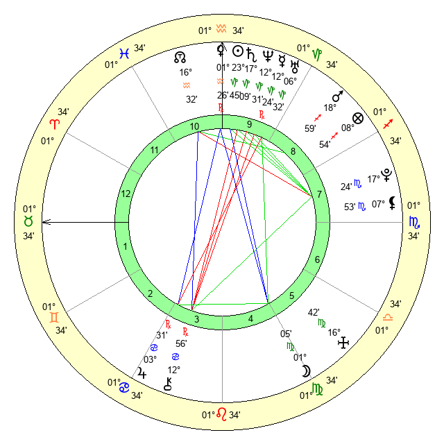 | Moon | 1 Virgo 2 | 27 Cancer 38 | 3 Sagittarius 47 |