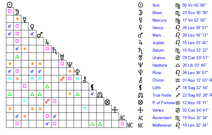 | Moon | 23 Scorpio 42 | 18 Virgo 54 | 13 Gemini 3 |