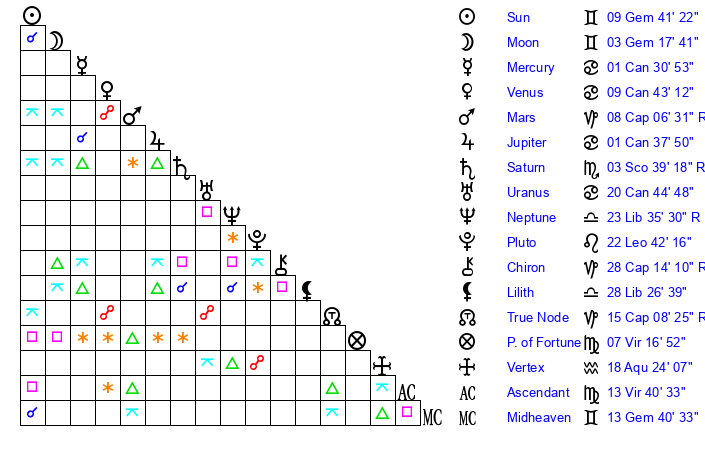 | Sun | 9 Gemini 41 | 10 Gemini 29 | 17 Leo 31 |