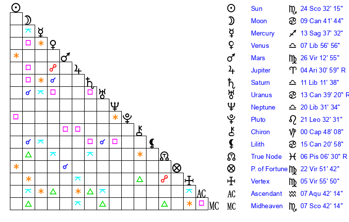 | Sun | 24 Scorpio 32 | 25 Scorpio 36 | 9 Aquarius 45 |