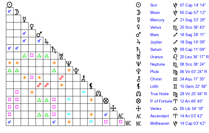 | Moon | 6 Capricorn 0 | 23 Sagittarius 43 | 23 Taurus 53 |