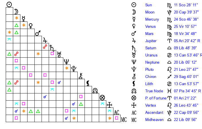 | Sun | 11 Scorpio 28 | 12 Scorpio 32 | 26 Capricorn 32 |