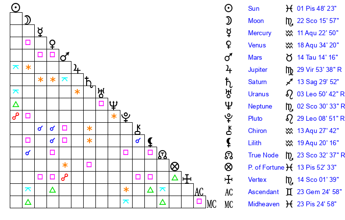 | Neptune | 2 Scorpio 30 | 28 Pisces 35 | 1 Scorpio 0 |