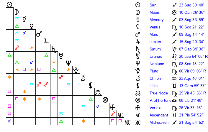 | Jupiter | 15 Sagittarius 14 | 23 Cancer 12 | 28 Sagittarius 26 |