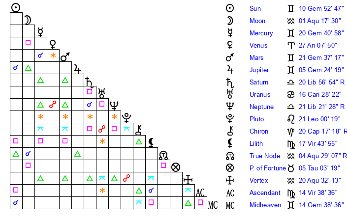 | Mercury | 20 Gemini 41 | 14 Gemini 36 | 0 Leo 54 |