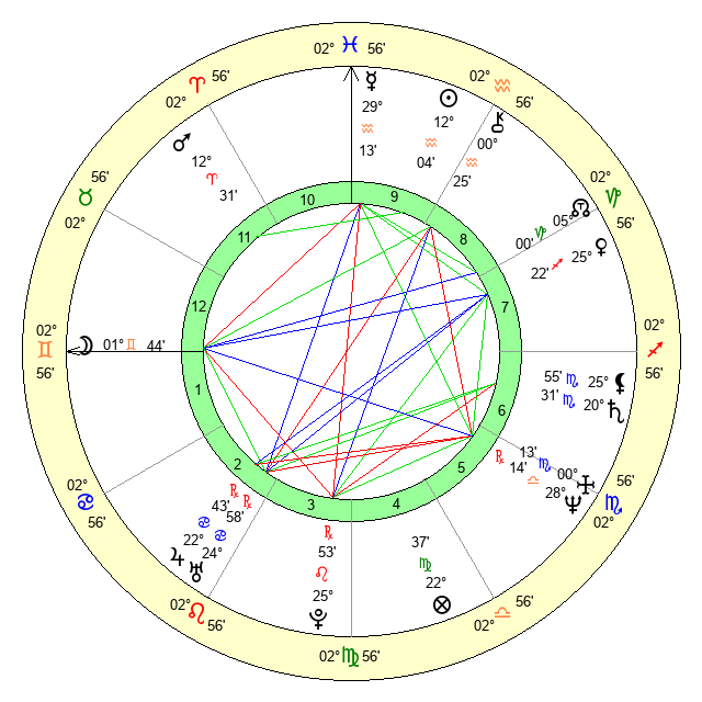 | Moon | 1 Gemini 54 | 25 Pisces 0 | 21 Sagittarius 38 |