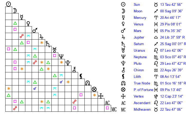 | Moon | 0 Sagittarius 11 | 16 Leo 8 | 6 Taurus 16 |