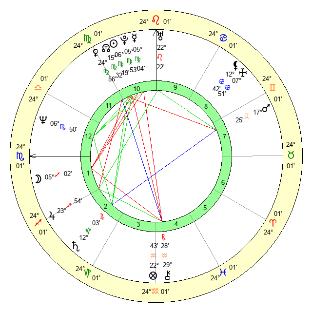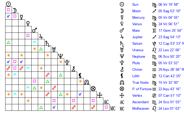 | Venus | 24 Virgo 57 | 4 Leo 48 | 14 Sagittarius 38 |