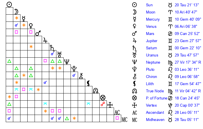 | Sun | 20 Taurus 21 | 21 Taurus 15 | 9 Leo 45 |