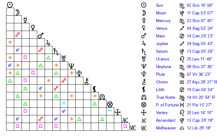 | Sun | 2 Scorpio 17 | 2 Scorpio 32 | 8 Capricorn 0 |