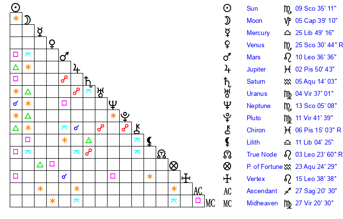 Neptune | 13 Scorpio 4 | 27 Pisces 28 | 15 Scorpio 7 |
