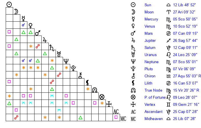 Sun | 12 Libra 49 | 13 Libra 4 | 18 Sagittarius 1 |