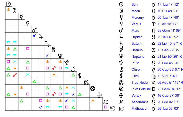 | Saturn | 22 Libra 45 | 28 Pisces 30 | 21 Libra 38 |