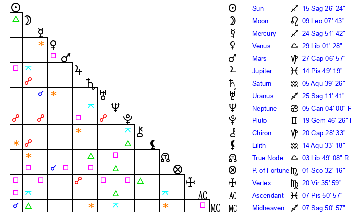 | Uranus | 25 Sagittarius 9 | 28 Taurus 45 | 29 Sagittarius 53 |