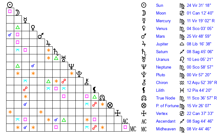 | Sun | 24 Virgo 31 | 25 Virgo 3 | 2 Sagittarius 9 |