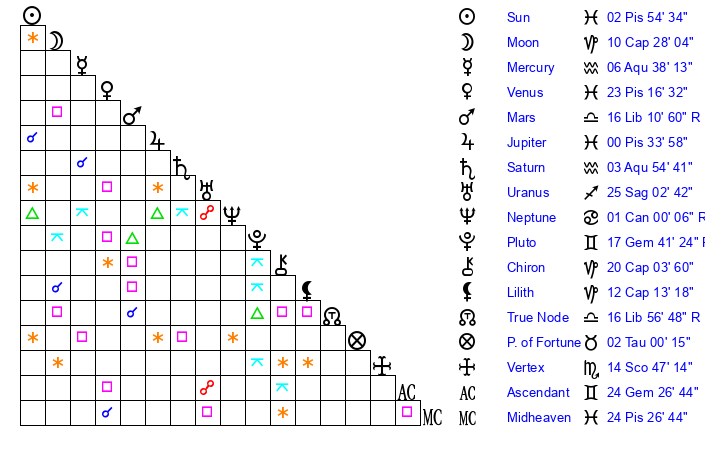 | Sun | 2 Pisces 55 | 4 Pisces 19 | 1 Cancer 59 |