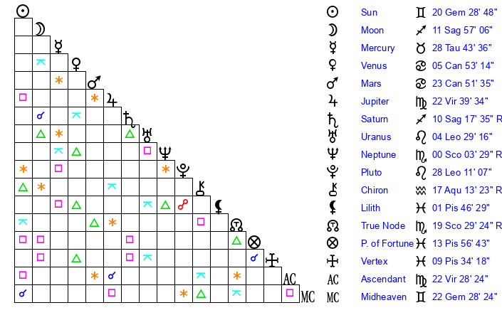 | Sun | 20 Gemini 29 | 21 Gemini 1 | 25 Leo 27 |