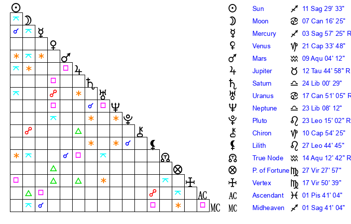 | Sun | 11 Sagittarius 29 | 11 Sagittarius 47 | 25 Aquarius 43 |