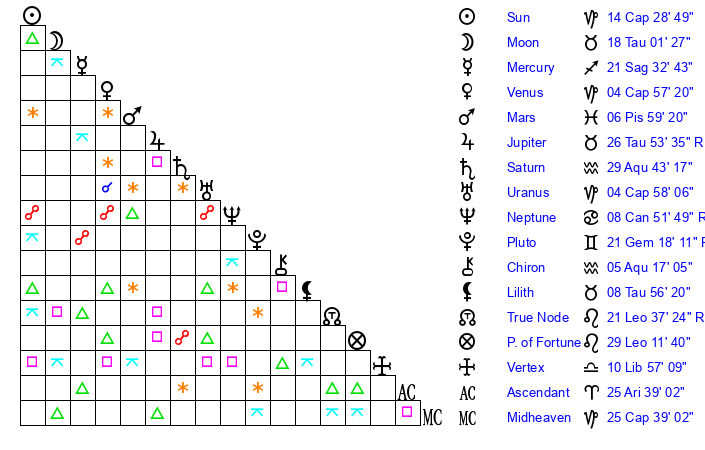 | Sun | 14 Capricorn 29 | 15 Capricorn 22 | 14 Taurus 16 |