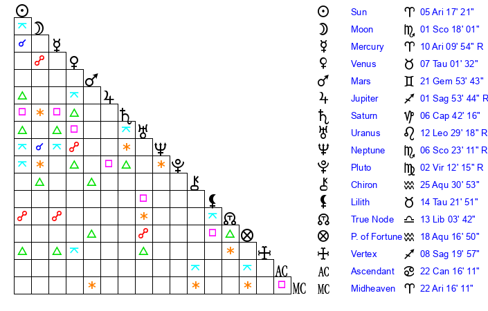 | Moon | 1 Scorpio 13 | 28 Aquarius 29 | 6 Aries 22 |