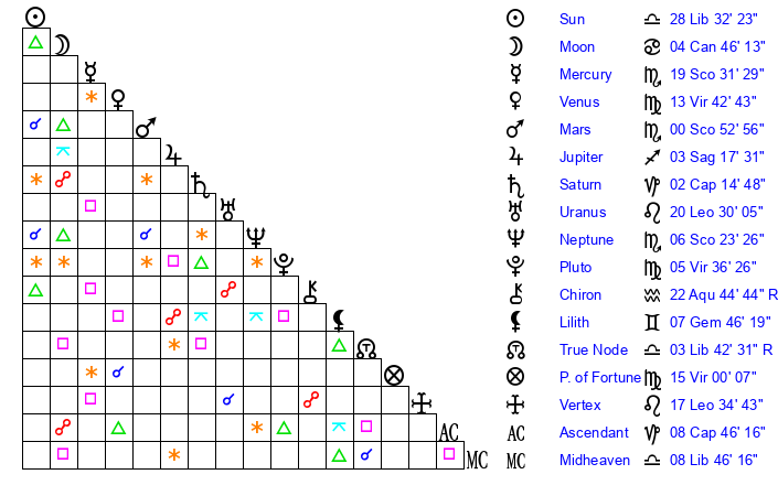 | Neptune | 6 Scorpio 23 | 29 Pisces 59 | 8 Scorpio 35 |