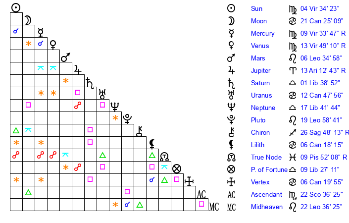 | Venus | 13 Virgo 49 | 3 Leo 36 | 0 Libra 54 |