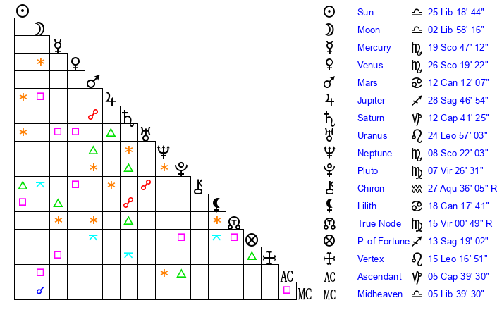 | Moon | 3 Libra 1 | 24 Virgo 15 | 29 Aquarius 55 |