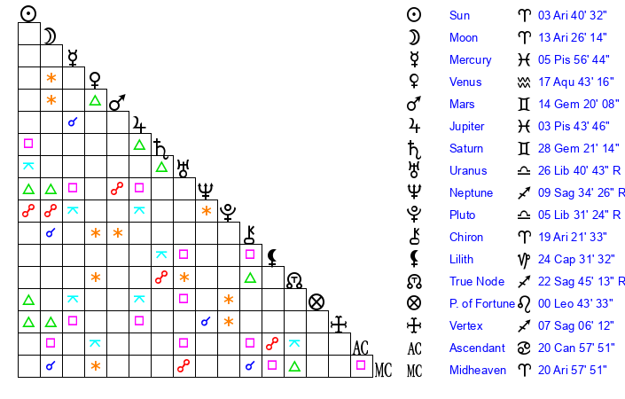| Sun | 3 Aries 40 | 4 Aries 18 | 23 Taurus 30 |