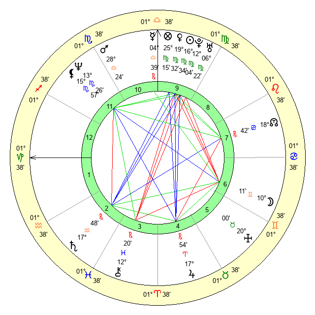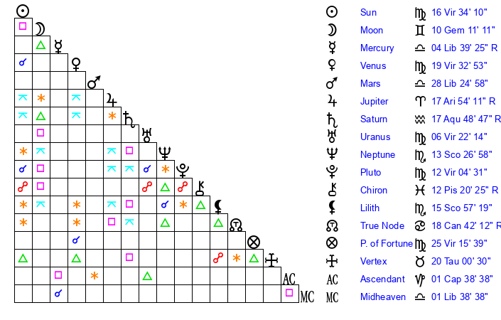 | Sun | 16 Virgo 34 | 17 Virgo 33 | 17 Scorpio 52 |