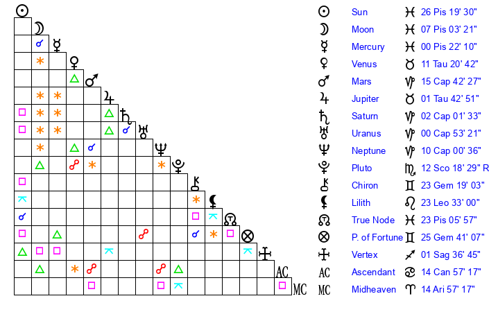 | Moon | 7 Pisces 11 | 22 Libra 44 | 19 Cancer 11 |