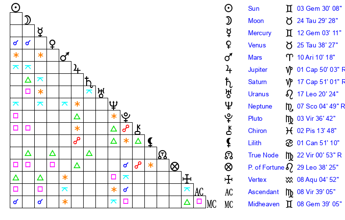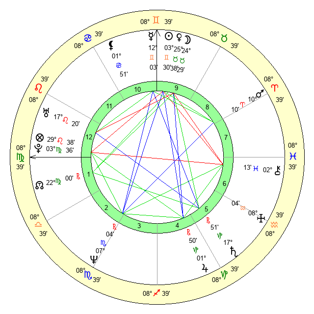 | Sun | 3 Gemini 30 | 3 Gemini 46 | 5 Leo 35 |