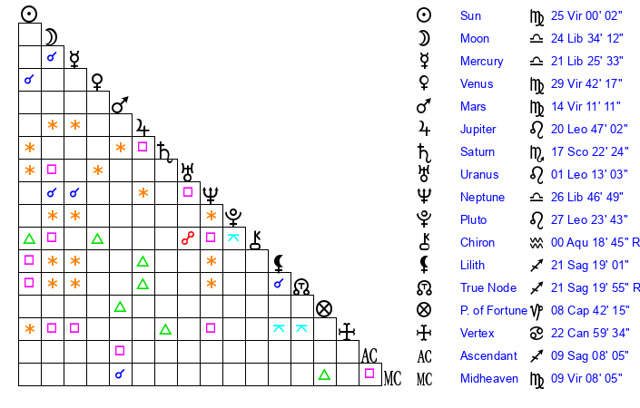 | Sun | 25 Virgo 0 | 26 Virgo 2 | 4 Sagittarius 40 |