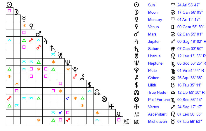 | Sun | 24 Aries 58 | 25 Aries 58 | 28 Gemini 37 |